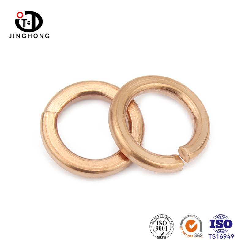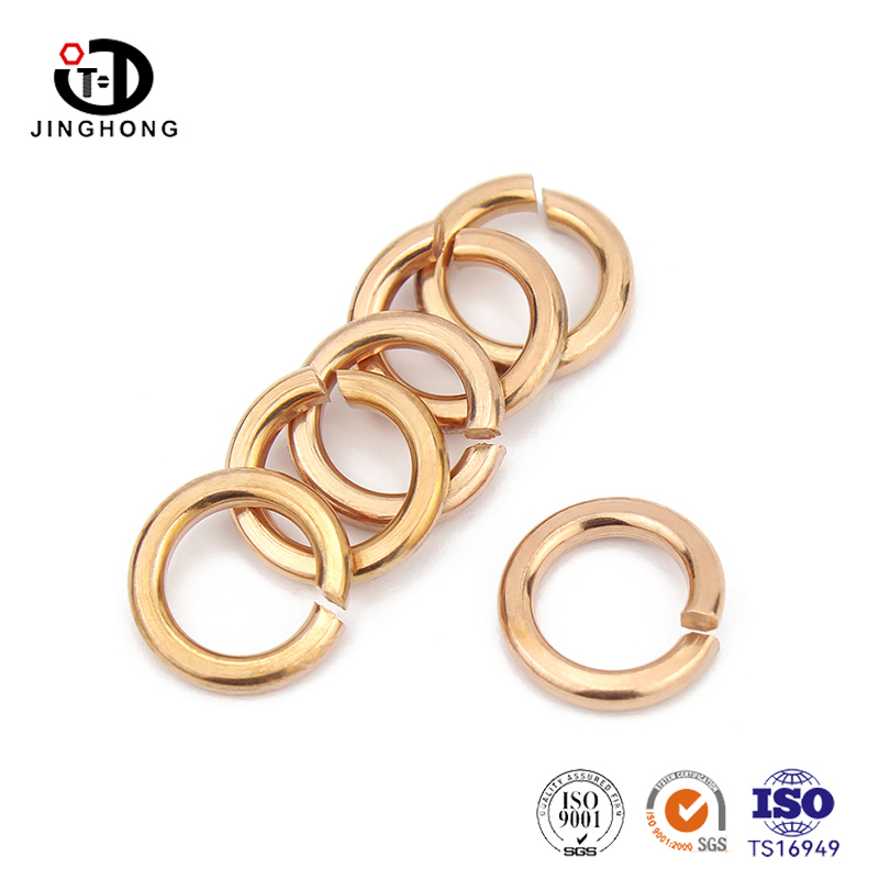 Messingfjedervaskemaskine- En fjedervaskemaskine er en vaskemaskine lavet stort set af messing. Det er fjedrende, korrosionsbestandigt og ofte elektrisk ledende. Normalt en ring med en delt åbning. Opdelingen giver en vis fleksibilitet til samling og hjælper med at forhindre løsning ved vibration, stød eller temperaturændring.