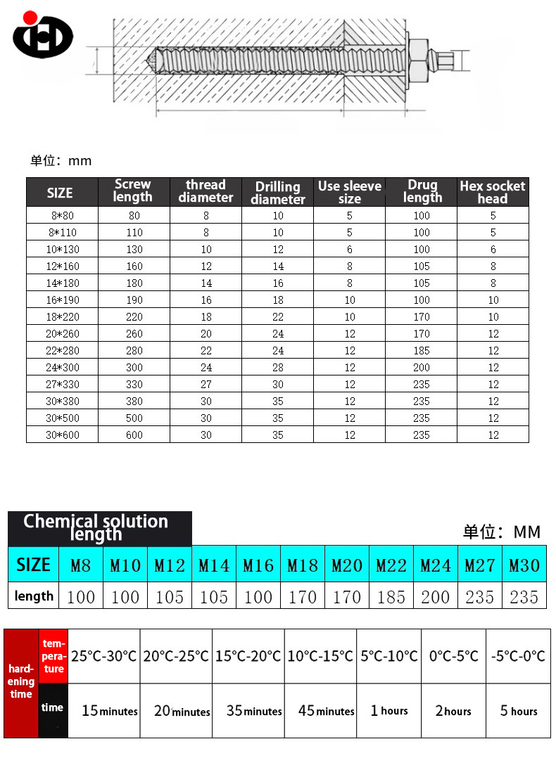 Den kemiske ekspansionsbolt vedtager et kombinationsdesign af "kemisk slange+skrue", som er fastgjort med en speciel kemisk opslæmning til dannelse af et højstyrkelseslag med underlaget, og forankringskraften kan sammenlignes med den for indlejrede dele. Det er vidt brugt i konstruktion af stålstruktur, udstyr til udstyr, installation af gardinvæg og andre scener med egenskaberne ved superbærende, jordskælvsmodstand, aldringsmodstand, praktisk installation osv.